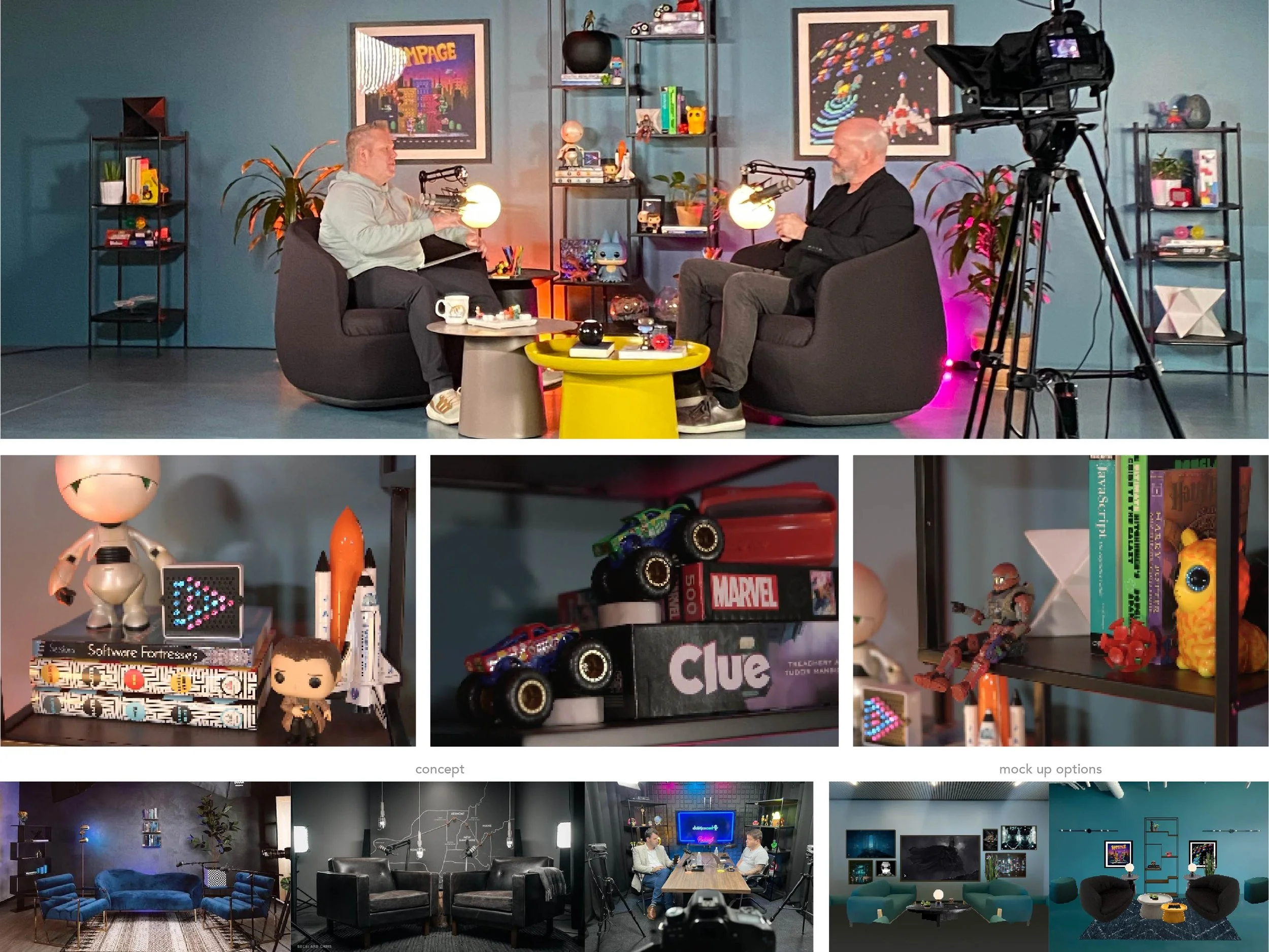 I envisioned a setup that would evoke the ambiance of a developer’s computer lair, but also use existing furniture from headquarters to keep costs low. I started by collecting inspirational images, then presented two options to the team for selection, and ultimately brought the chosen set to life with additional styling elements.